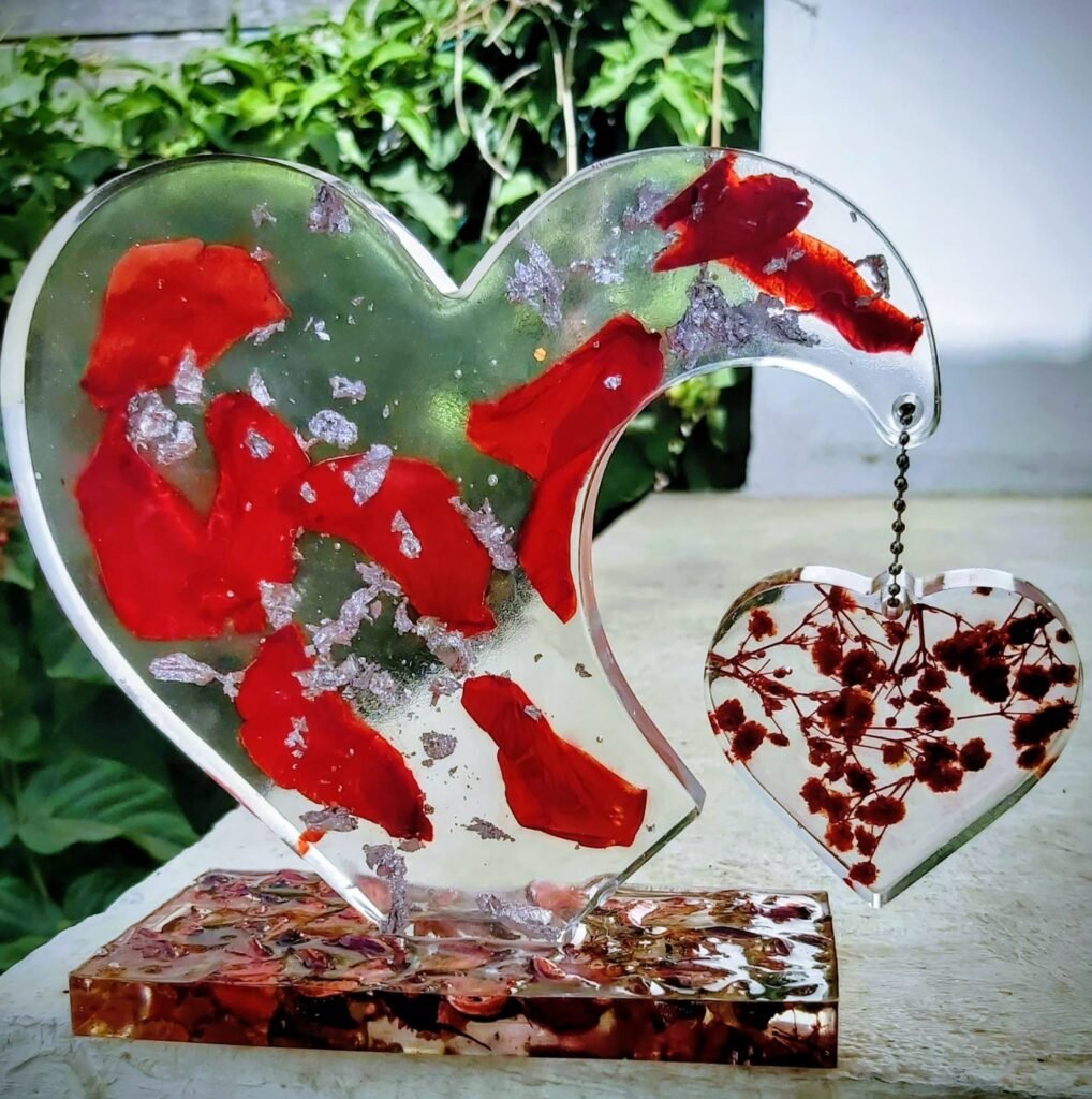 מוצר נוי דקורטיבי עם פרחים בצבע אדום מיובשים ושבבי נייר כסוף