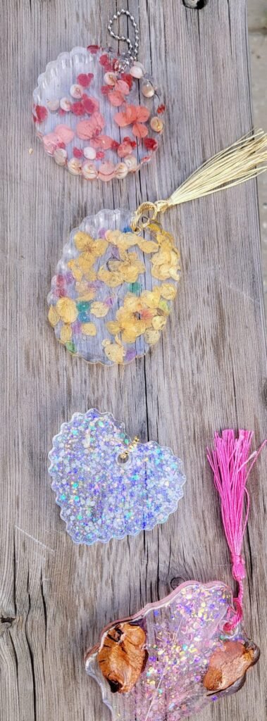 מחזיקי מפתחות יחודיים מחומר האפוקסי בעבודת יד עם פרחים מיובשים/ פיגמנט נצנצים.